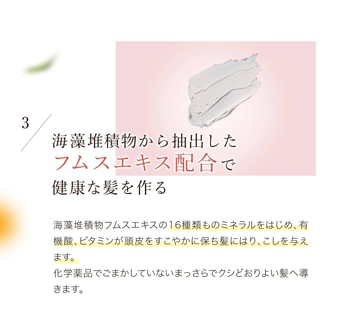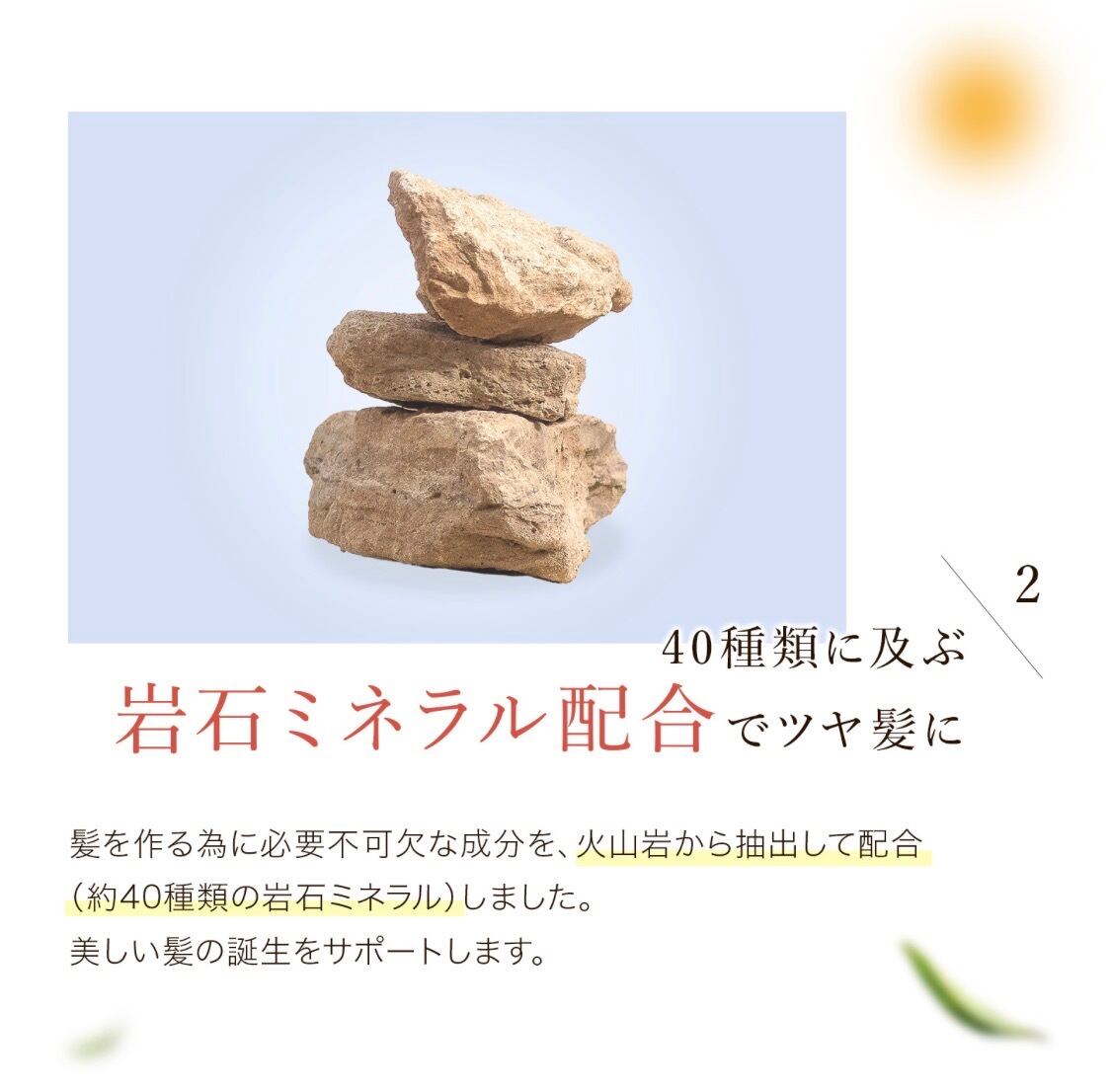 5種類の精油(オレンジ油、グレープフルーツ果皮油、ライム油、イランイラン花油、ラベンダー油)によるシトラス系のアロマタイプで、岩石抽出ミネラルなどの栄養成分が地肌と紙に働きかけ、健康でいきいきとした髪に作り変えていきます。